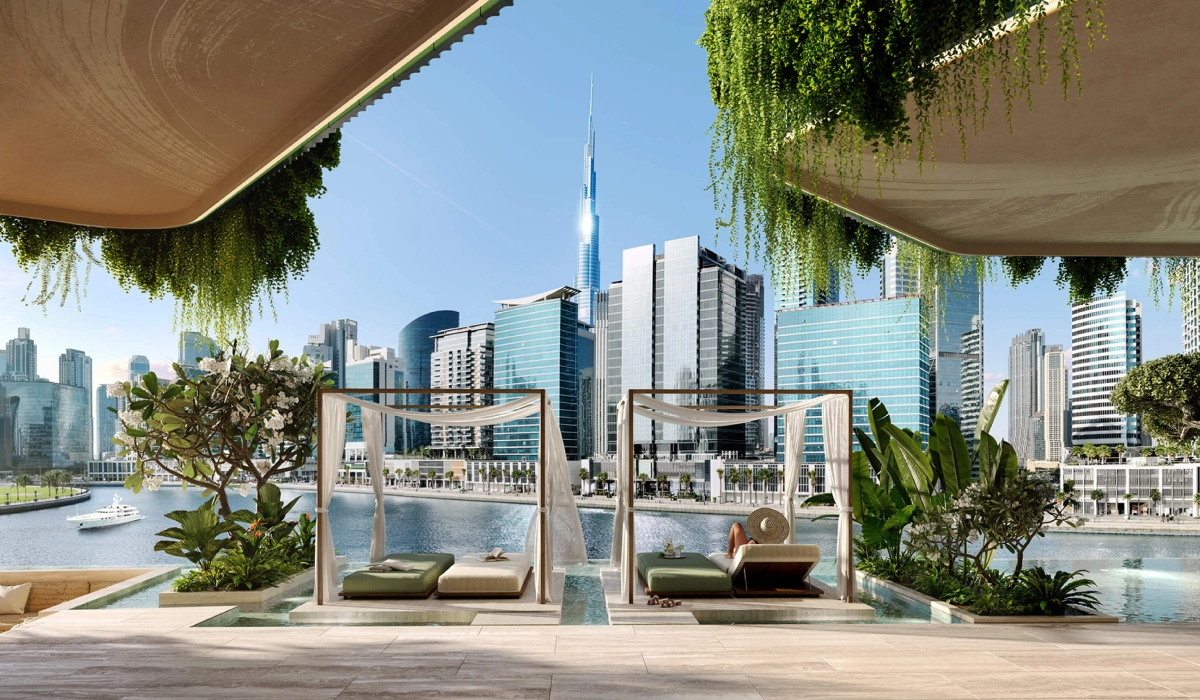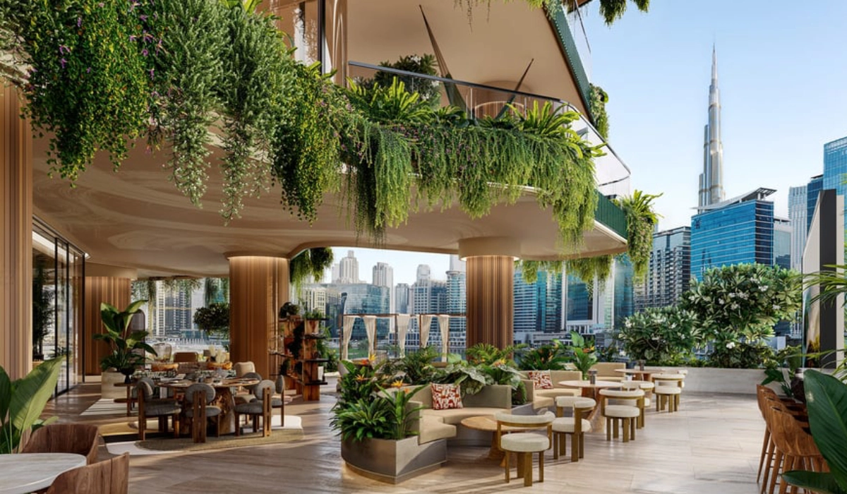The building’s form feels organic, almost alive. Curved balconies and cascading terraces echo the tangle of roots, overlooking the Dubai Canal and Downtown skyline.