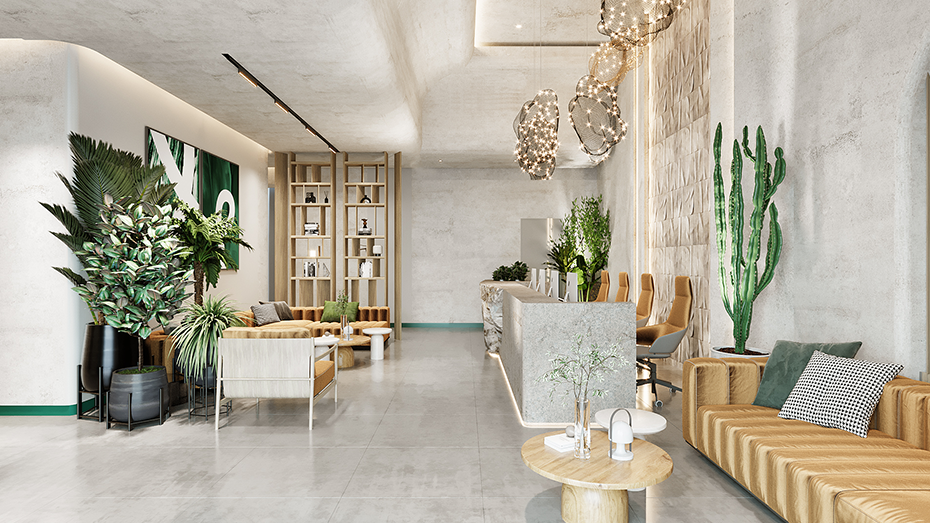 The choice of neutral colours, soft lighting, and biophilic elements enhances the sense of space and relaxation. Natural materials, such as stone-textured GRG and sandstone tiles, add a rustic yet elegant touch, while wooden slats and 3D wall graphics in the gym create visual interest. The gym’s stretch ceiling and vertical wall lighting contribute further character to the space.